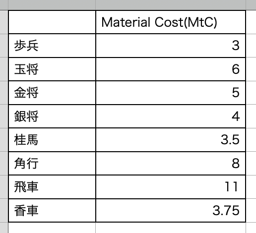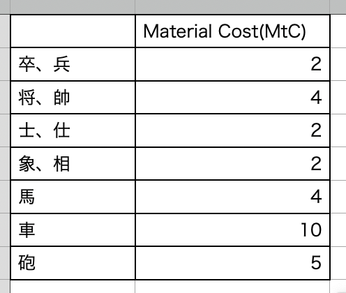 マテリアルコスト[Material Cost : MtC]とは、古典ゲームに登場するすべての駒が持つ、固有のコストです。
