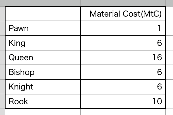 チェスにおけるマテリアルコストを表にしてみました。