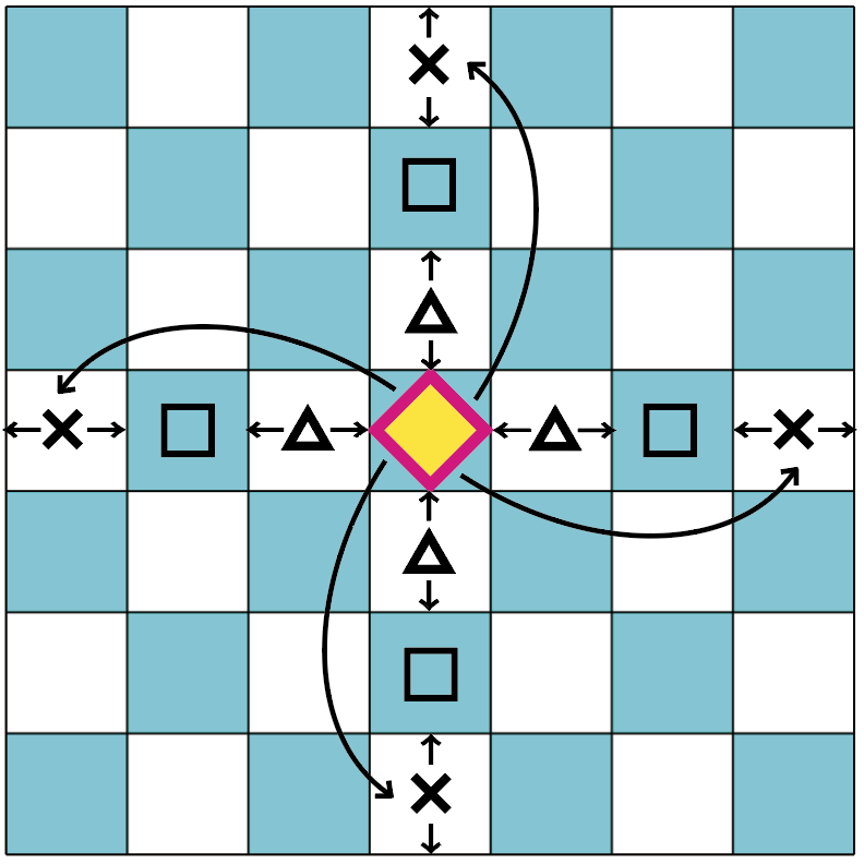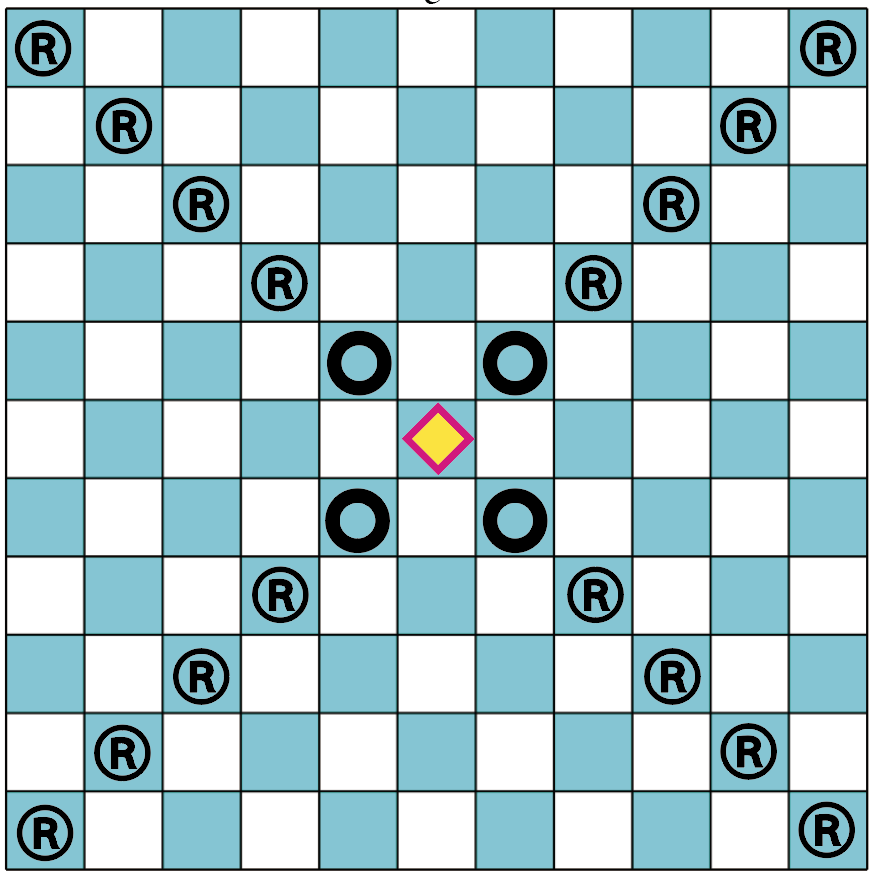ここで、注意して欲しいのは、中心の黄色い菱形のマークの周囲のマスは、”Ⓡ”でなく”◯”になっている点です。