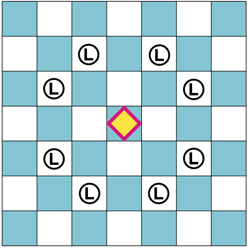 ナイトは、八方桂とも呼ばれ、8方向にL字のジャンプを行うことができます。